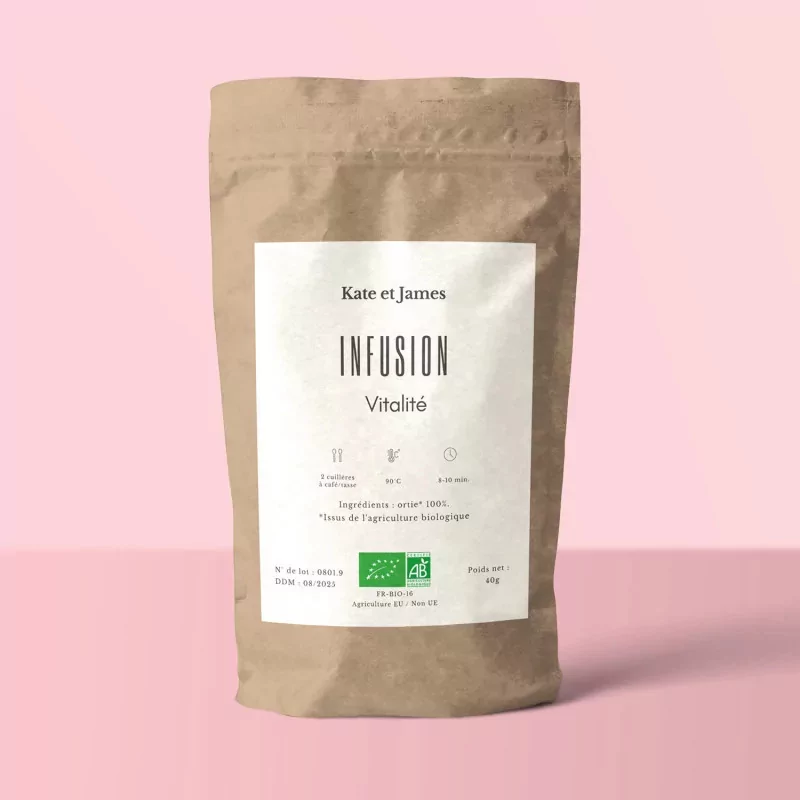 Découvrez l'infusion Framboise Coco de Kate et James, une infusion 100% bio à l'ortie participant à la santé de la peau.
